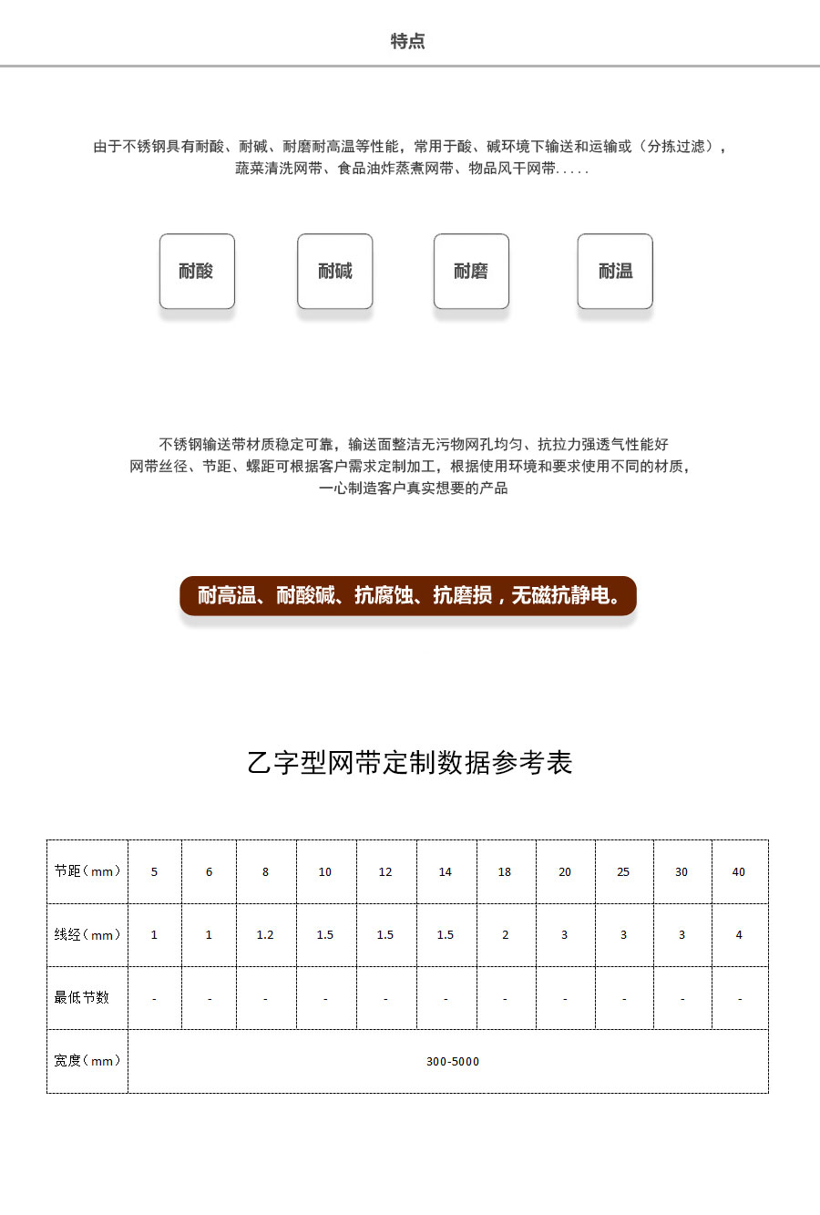 乙字型网带又称乙型网带、食品网带、巧克力网带,使用不锈钢高弹韧丝制作。网带多用单小边结构,双小边结构用于特殊用途。可用于直线输送机,也可用于转弯运输机。网宽300mm-5000mm,通常情况下用齿轮定位传动。也可采用链条驱动。
